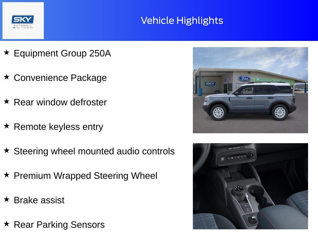 Azure Gray Metallic Tri-Coat 2025 Ford Bronco Sport Heritage 4WD 8-Speed Automatic 1.5L EcoBoost Alloy wheels, Brake assist, Convenience Package, Equipment Group 250A, Front Driver/Passenger Seat Back Map Pockets, Heated 8-Way Power Driver's Seat, Heated door mirrors, LED Fog Lamps, Premium Wrapped Steering Wheel, Rear Parking Sensors, Rear window defroster, Remote keyless entry, Split folding rear seat, Steering wheel mounted audio controls, Universal Garage Door Opener (UGDO). Price includes: $2000 - Retail Customer Cash. Exp. 03/31/2026