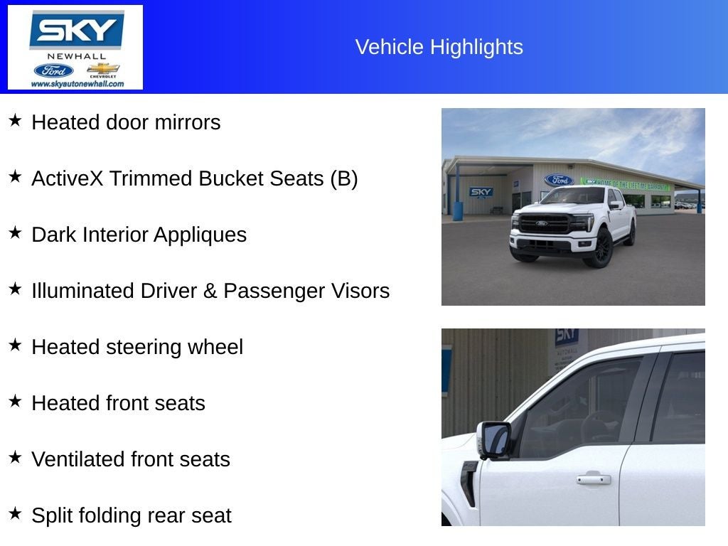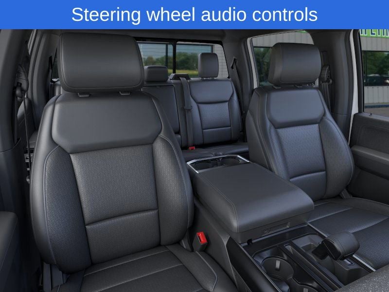 Lariat 4WD, 6 Angular Bright Anodized Step Bar, ActiveX Trimmed Bucket Seats (B), Black Alloy Wheels, Black Exterior Badging, Black Grille, Black Taillamp Bezels, Body-Color Front & Rear Bumpers, Body-Color Skull Caps & Door Handles, Brake assist, Dark Interior Appliques, Equipment Group 501A Mid, Gray Box Side Decal, GVWR: 7,100 lbs Payload Package, Heated door mirrors, Heated front seats, Heated steering wheel, Illuminated Driver & Passenger Visors, Integrated Trailer Brake Controller, Lariat Black Appearance Package, Matte Black Tailgate F-150 Decal, Power-Sliding Rear Window, Rear window defroster, Remote keyless entry, Split folding rear seat, Steering wheel audio controls, Tow/Haul Package, Ventilated front seats, Wheels: 20 Chrome-Like PVD.