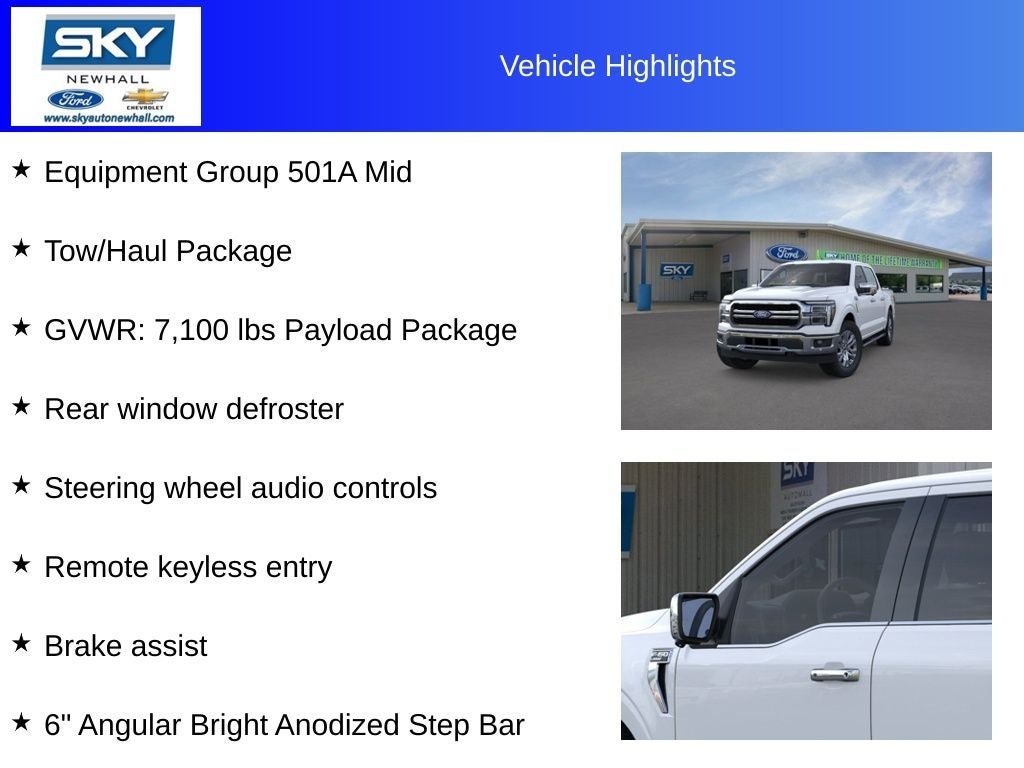 Lariat 4WD, 6 Angular Bright Anodized Step Bar, Black Alloy Wheels, Brake assist, Equipment Group 501A Mid, GVWR: 7,100 lbs Payload Package, Heated door mirrors, Heated steering wheel, Illuminated Driver & Passenger Visors, Integrated Trailer Brake Controller, Power-Sliding Rear Window, Rear window defroster, Remote keyless entry, Split folding rear seat, Steering wheel audio controls, Tow/Haul Package, Ventilated front seats, Wheels: 20 Chrome-Like PVD. Price includes: $2000 - Retail Customer Cash. Exp. 03/31/2026 $500 - Retail Bonus Cash. Exp. 03/31/2026 Discount available on eligible purchases when you finance through a participating preferred lender and trade in a 2016 or newer vehicle with fewer than 75,000 miles. Customers using outside financing or manufacturer special APR programs (including 0%) are not eligible. All financing subject to credit approval and program availability. Offer valid through Exp. 02/27/2026. See dealer for details Discount available on eligible purchases when you finance through a participating preferred lender and trade in a 2016 or newer vehicle with fewer than 75,000 miles. Customers using outside financing or manufacturer special APR programs (including 0%) are not eligible. All financing subject to credit approval and program availability. Offer valid through Exp. 02/28/2026. See dealer for details Discount available on eligible purchases when you finance through a participating preferred lender and trade in a 2016 or newer vehicle with fewer than 75,000 miles. Customers using outside financing or manufacturer special APR programs (including 0%) are not eligible. All financing subject to credit approval and program availability. Offer valid through Exp. 01/31/2031. See dealer for details