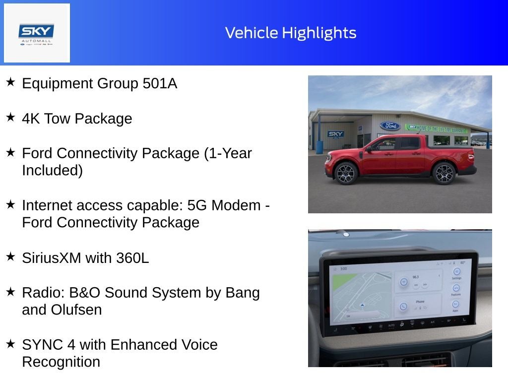 Ruby Red Metallic Tinted Clearcoat 2026 Ford Maverick Lariat AWD CVT 2.5L I-4 Hybrid 2.5L I-4 Hybrid, 2.91 Axle Ratio, 4K Tow Package, ActiveX Trimmed Heated Front Bucket Seats, Alloy wheels, Apple CarPlay/Android Auto, Brake assist, Equipment Group 501A, Exterior Parking Camera Rear, Ford Connectivity Package (1-Year Included), Heated door mirrors, Heated front seats, Heated steering wheel, Internet access capable: 5G Modem - Ford Connectivity Package, Radio: B&O Sound System by Bang and Olufsen, Remote keyless entry, SiriusXM with 360L, Steering wheel mounted audio controls, SYNC 4 with Enhanced Voice Recognition, Trailer Brake Controller, Trailer Hitch (class III) 2 Receiver, Upgraded Cooling Fan, Wheels: 19 Machined Aluminum Painted.