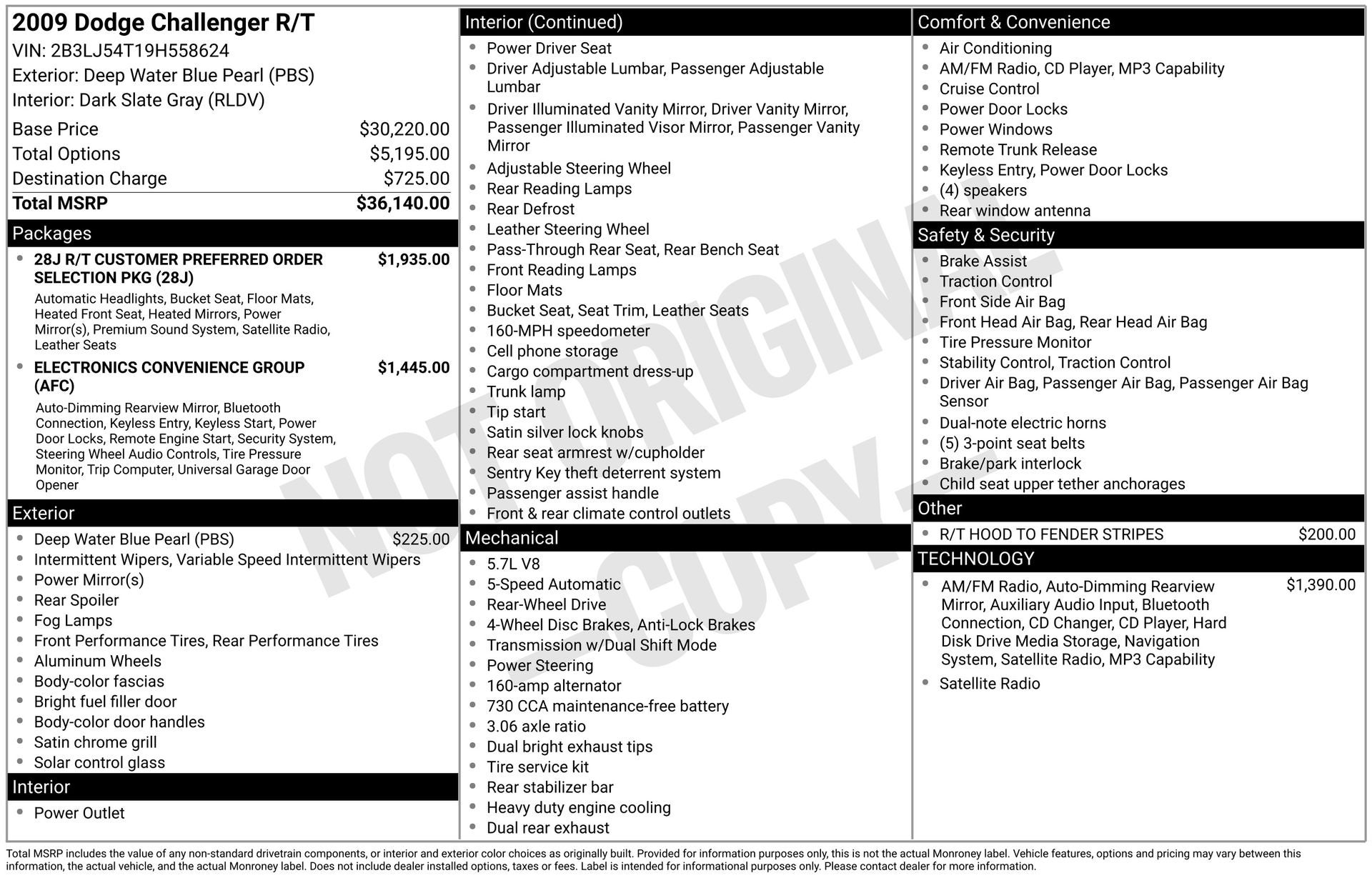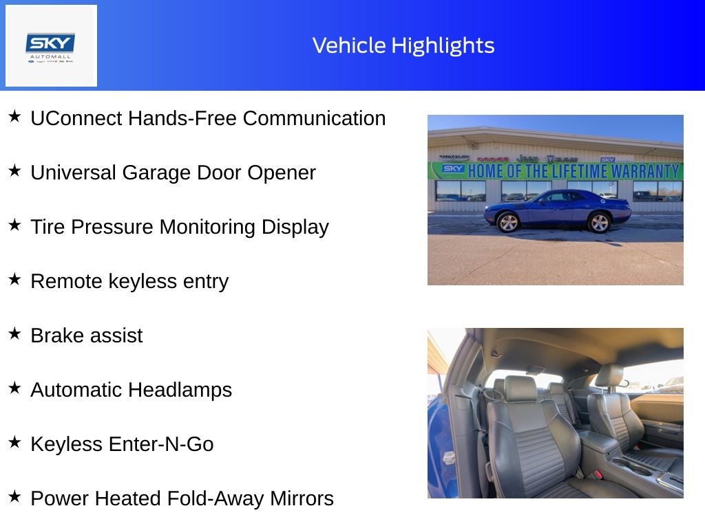 5.7L 8-Cylinder SMPI OHV, 276 Watt Amplifier, Alloy wheels, Automatic Headlamps, Brake assist, Electronics Convenience Group, Heated Front Seats, Illuminated Cupholders, Illuminated Door Pull Handles, Instrument Cluster w/Display Screen, Keyless Enter-N-Go, Leather Shift Knob, Leather Trimmed Bucket Seats, Luxury Front & Rear Floor Mats, Power Heated Fold-Away Mirrors, Quick Order Package 28J (DISC), Rear window defroster, Rear-View Auto-Dimming Mirror w/Microphone, Remote keyless entry, Security Alarm, SIRIUS Satellite Radio, Split folding rear seat, Spoiler, Steering Wheel Mounted Audio Controls, Temperature & Compass Gauge, Tire Pressure Monitoring Display, Traveler/Mini Trip Computer, UConnect Hands-Free Communication, Universal Consumer Interface (UCI), Universal Garage Door Opener, Vehicle Information Center. Deep Water Blue PC/Light Graystone PC 2009 Dodge Challenger R/T RWD 5-Speed Automatic 5.7L 8-Cylinder SMPI OHV