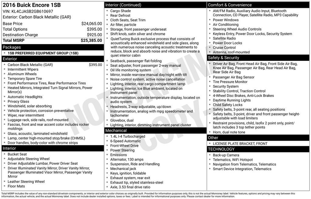 With Buick’s reputation for refinement and reliability, the 2016 Encore Base is an excellent choice for drivers looking for a stylish, user-friendly SUV that delivers comfort and confidence every time you get behind the wheel.