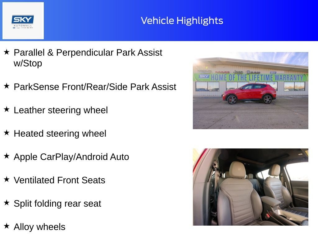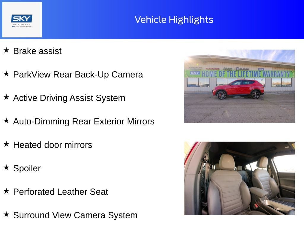 1.3L I4, Active Assist Advanced Package, Active Driving Assist System, Alloy wheels, Apple CarPlay/Android Auto, Auto-Dimming Rear Exterior Mirrors, Brake assist, Driver Seat Memory, harman/kardon Premium Audio, Heated door mirrors, Heated steering wheel, Leather steering wheel, Parallel & Perpendicular Park Assist w/Stop, ParkSense Front/Rear/Side Park Assist, ParkView Rear Back-Up Camera, Perforated Leather Seat, Premium Interior & Sound Package, Quick Order Package 28E, Rear window defroster, Remote keyless entry, Split folding rear seat, Spoiler, Steering wheel mounted audio controls, Surround View Camera System, Ventilated Front Seats. Alfa Rosso 2024 Alfa Romeo Tonale Veloce AWD 6-Speed Automatic 1.3L I4