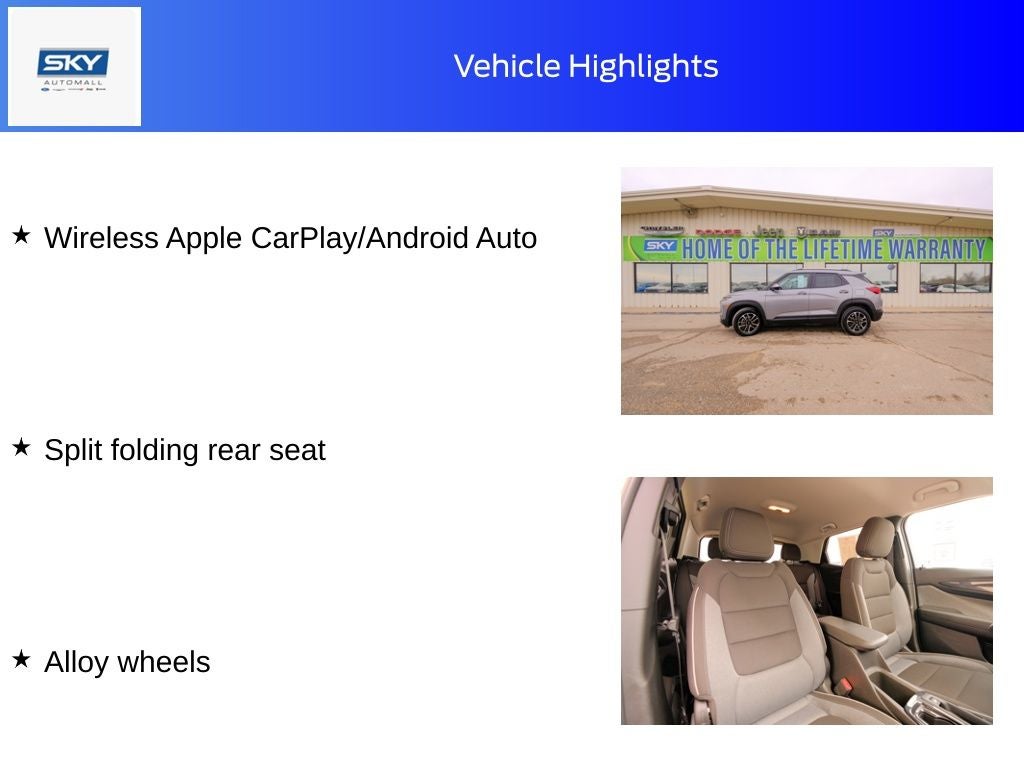 Alloy wheels, Brake assist, Exterior Parking Camera Rear, Heated door mirrors, Preferred Equipment Group 1LT, Rear window defroster, Remote keyless entry, Split folding rear seat, Spoiler, Steering wheel mounted audio controls, Wireless Apple CarPlay/Android Auto. Sterling Gray Metallic 2025 Chevrolet TrailBlazer LT FWD CVT 1.3L I3 Turbocharged DOHC 12V LEV3-SULEV30 137hp