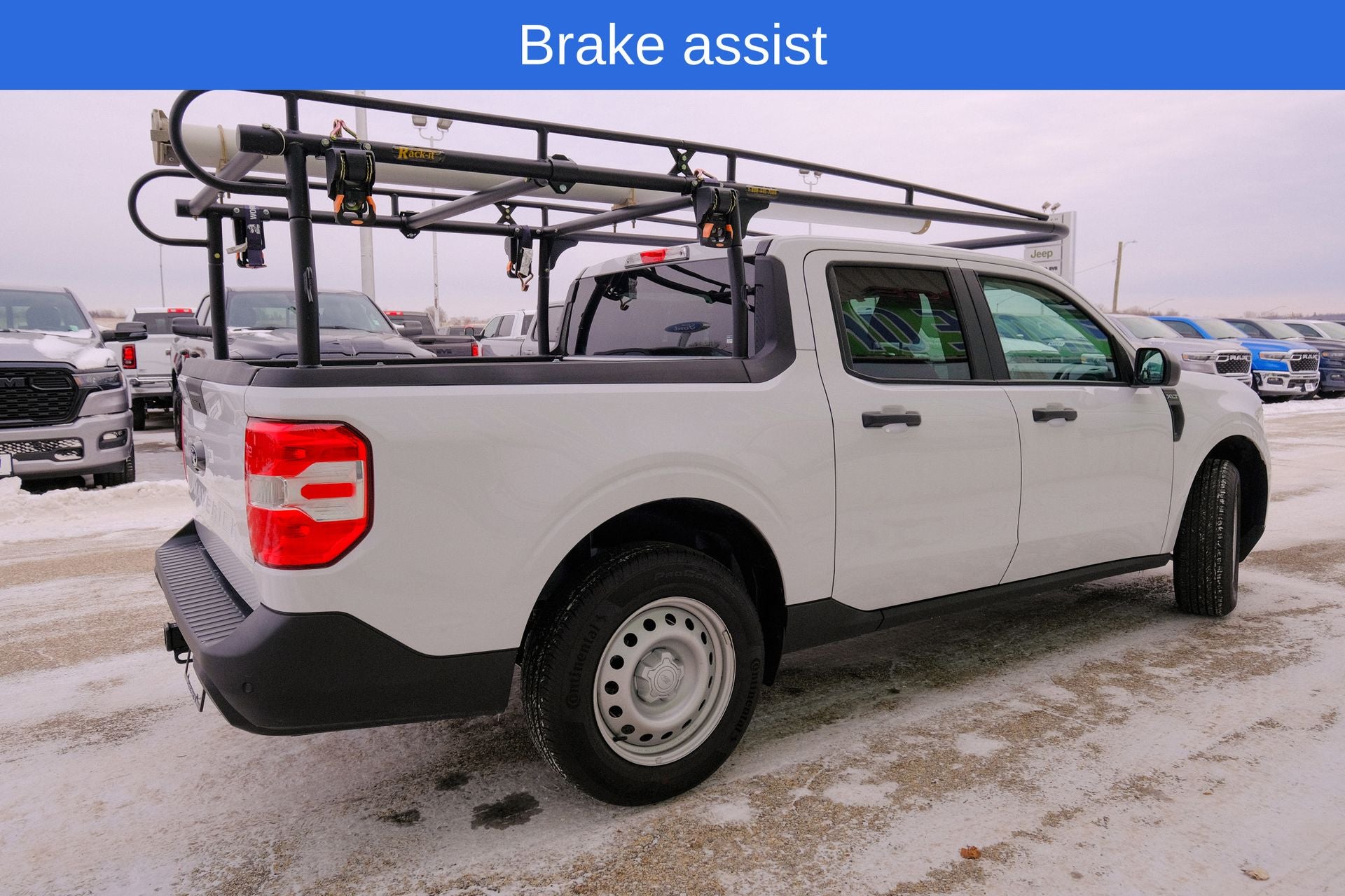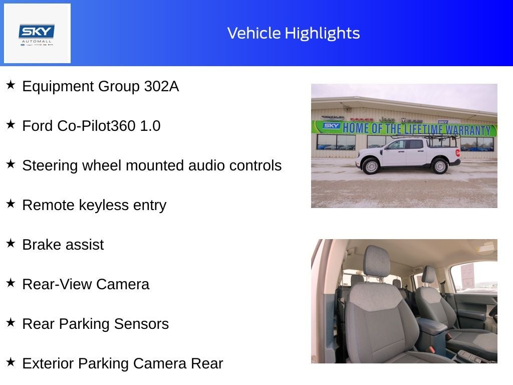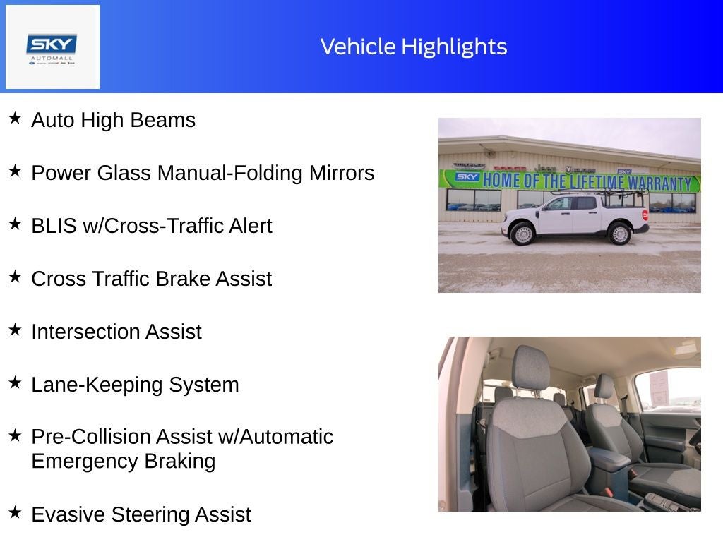 Alloy wheels, Apple CarPlay/Android Auto, Auto High Beams, BLIS w/Cross-Traffic Alert, Brake assist, Cross Traffic Brake Assist, Equipment Group 302A, Evasive Steering Assist, Exterior Parking Camera Rear, Ford Co-Pilot360 1.0, Intersection Assist, Lane-Keeping System, Power Glass Manual-Folding Mirrors, Pre-Collision Assist w/Automatic Emergency Braking, Rear Parking Sensors, Rear-View Camera, Remote keyless entry, Steering wheel mounted audio controls. Oxford White 2025 Ford Maverick XLT AWD 8-Speed Automatic EcoBoost 2.0L I4 GTDi DOHC Turbocharged VCT